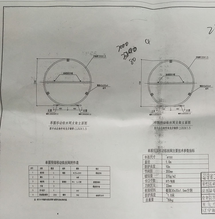 2、单圈形刺丝滚笼采用直径1000mm,拉伸后节距为200mm;刺丝连接卡厚度1.5mm±0.05,刀刺宽度22mm,两刃垂直间距15mm,刀刺纵向间距34mm,芯丝材质为热镀锌弹簧钢丝,直径为2.5mm ;镀锌量采用275g/㎡。