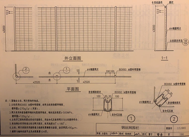 2.钢丝网围墙立柱采用80X60M型冷弯型钢,材料为连续热镀锌钢板,镀锌量≥270g/㎡(双面)。