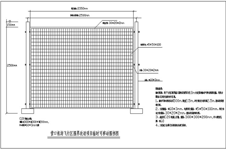 3、飞机场项目工地临时可移动围挡立柱规格Φ60*3.0mm,网片规格50*100*5mm,网片四周方管规格20*30*2mm,整体表面镀锌处理。
