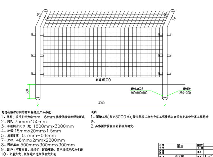 3、网片高1800mm,网片宽3000mm;