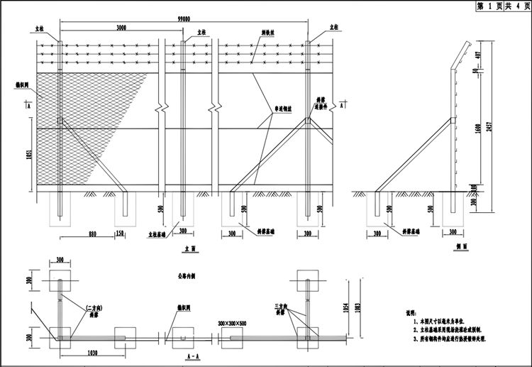 编织网隔离栅的立柱采用冷弯等边槽钢,编织网孔尺寸160*80mm,立柱间距为3m。每隔99m设置一处三向斜撑,凡拐角处均应设置单向斜撑。在跨越天然障碍时,编织网隔离栅的端头立柱均应设置垂直双向斜撑。编织网隔离栅的所有钢构件均应进行热浸镀锌处理,立柱、斜撑等构件的镀锌量为600g/㎡,螺栓、螺母等连接件的镀锌量为350g/㎡,钢丝的镀锌量为120g/㎡。热浸镀锌所用的锌应为《锌锭》(GB470-2008)中所规定的Zn99.995号锌。浸塑材料采用聚乙烯(PE)高分子涂料,立柱、斜撑浸塑层厚度>0.25mm,网片浸塑层厚度>0.15mm,颜色为绿色,全线色号应统一。防腐要求须满足《公路交通工程钢构件防腐技术条件》(GB/T 18226-2015)的规定,涂层性能应满足《公路用防腐蚀粉末涂料及涂层》(JT/T600.1-2004~JT/T600.4-2004)的规定和要求。立柱基础采用 C20 预制素混凝土,斜撑基础为 C20 现浇素混凝土。