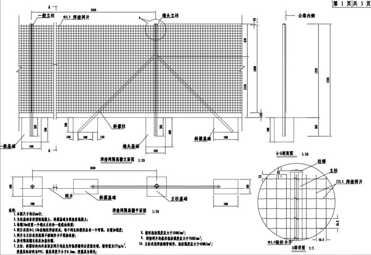 F-Ww-C焊接网隔离栅由立柱、网片、斜撑柱及紧固件等组成。F-Ww-C焊接网隔离栅立柱采用燕尾柱,其中端头立柱由60*2.0mm的焊接钢管加工制成,一般立柱和拐角立柱由48*1.5mm焊接钢管加工制成;隔离栅斜撑柱采用38*1.5mm焊接圆钢管,焊接网由2.5mm低碳钢丝焊接而成,网孔尺寸为101.6*50.8mm。每一卷焊接网的长度为30m。焊接网的立柱间距为3.0m,每隔30m设置一个端头立柱,并配合设置两个斜撑柱,凡拐角处、封头处均应采用拐角立柱并设置横向斜撑柱。F-Ww-C焊接网隔离栅立柱、斜撑、网片均采用“热浸镀锌浸塑复合涂层”的防腐处理方式,热浸镀锌浸塑复合涂层由热浸镀锌内涂层和流化床浸塑外涂层组成。立柱、斜撑镀锌量不小于275g/㎡,网片镀锌量不小于90g/㎡。螺栓、螺母、垫圈等紧固件采用直接热浸镀锌的防腐处理方式,镀锌量不小于350g/㎡,螺栓、螺母及带螺纹的构件热浸镀锌后,应清理螺纹或做离心分离处理。F-Ww-C焊接网隔离栅热浸镀锌所用的锌应为《锌锭》(GB470-2008)中所规定的Zn99.995号锌。浸塑材料采用聚乙烯(PE)高分子涂料,立柱、斜撑浸塑层厚度>0.25mm,网片浸塑层厚度>0.15mm,颜色为绿色,全线色号应统一。防腐要求须满足《公路交通工程钢构件防腐技术条件》(GB/T 18226-2015)的规定,涂层性能应满足《公路用防腐蚀粉末涂料及涂层》(JT/T600.1-2004~JT/T600.4-2004)的规定和要求。F-Ww-C焊接网隔离栅立柱基础采用 C20 预制素混凝土,斜撑基础为 C20 现浇素混凝土。