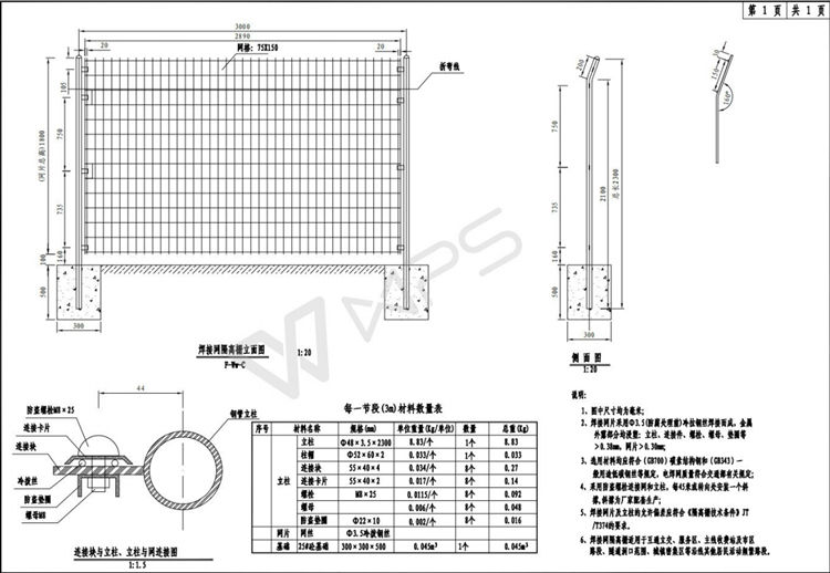 焊接网所有钢构件均采用普通碳素结构钢Q235制作。螺栓、螺母、垫圈等紧固件采用热浸镀锌处理,镀锌量为350g/㎡;其他所有钢构件均应先进行热浸镀锌处理后再进行浸塑处理,立柱的镀锌量不小于275g/㎡,其外层的涂层厚度不小于0.25mm,网片的镀锌量不小于90g/㎡,其外层的浸塑涂层厚度不小于0.15mm,塑层材料为PVC。隔离栅基础为C25号混凝土。