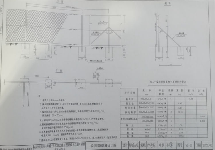 2.编织网隔离栅每隔99m在立柱两侧加斜撑,每198m或隔离栅改变方向处在立柱三个方向加斜撑。