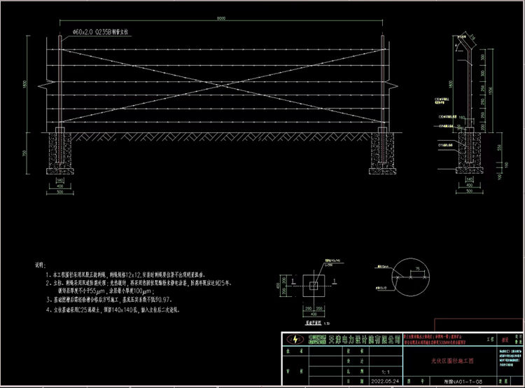 光伏区钢丝网围栏一般介绍:1、本工程围栏采用双股正捻刺绳,刺绳规格12#*12#,安装时刺绳要拉紧不出现明显弧垂。2、立柱、刺绳采用双道防腐处理。先热镀锌,再采用热固性聚酯粉末静电涂装,防腐年限应达到25年。镀锌层厚度不小于55微米,涂层不小于100微米。3、基础挖槽后需经验槽合格后方可施工,基底压实系数不低于0.97。4、立柱基础采用C25混凝土,预留140*140孔,插入立柱后二次浇筑。