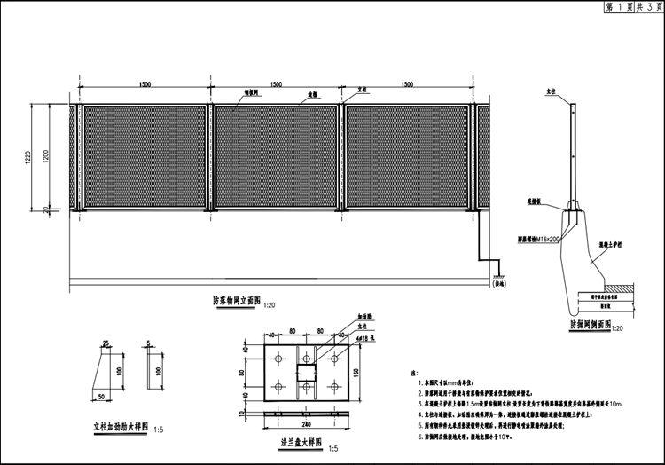 5) 施工时,首先在跨线桥与主线(或被交道路)交点处固定一块法兰盘,然后以该交点为中心,向两侧以 2m 为间距对称固定。当上跨桥梁为斜桥时,桥梁防护网应加长,以确保主线的安全。