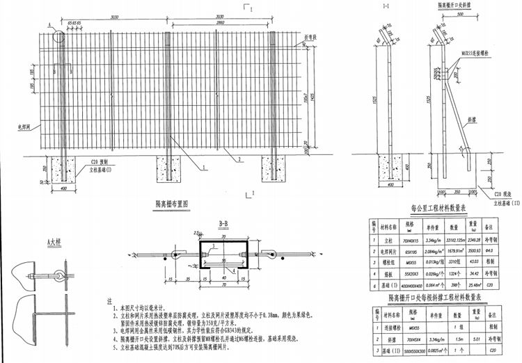 4、隔离栅开口处设置斜撑,立柱及斜撑预留N8螺栓孔并通过M6螺栓连接,基础采用现浇。
