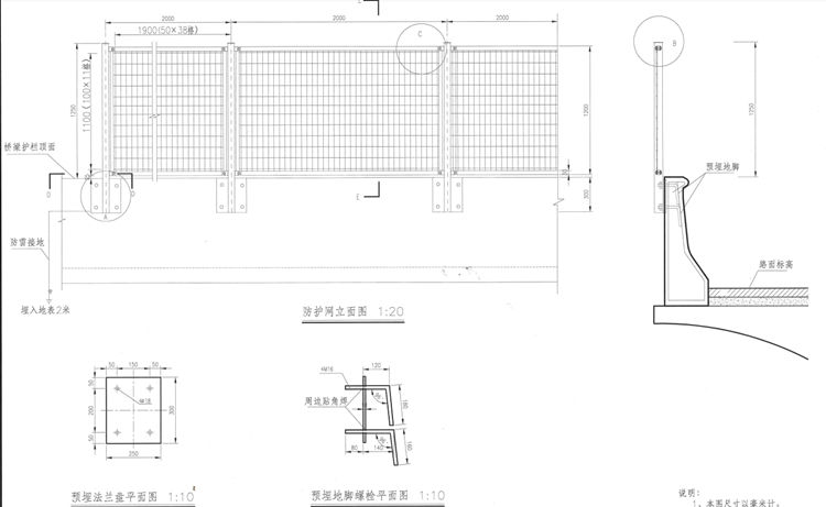 1、施工时,首先在跨线桥与主线(或被交道路)焦点处预埋一块法兰盘,然后以该交点为中心,向两侧以2.0米为间距对称预埋。当上跨桥梁为斜桥时,桥梁护网长度应相应加长。