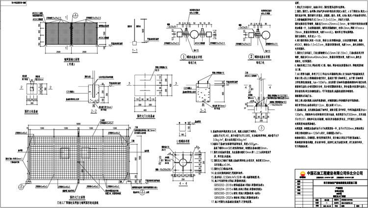 3.井场围栏非防翻越围栏单体尺寸2.5mx (1.5+0.5)m,具体尺寸见图。围栏边框采用方形钢管,规格为25mmx25mmx2.5mm,每个单体中间设竖向布置的加强筋一个,与边框规格相同 ;钢网采用低碳钢丝,丝径4.0mm,网眼141mmx78mm ,防腐采用浸塑处理,包塑1mm以上。钢丝网与方管边框焊接。围栏为艳绿色,色号为SJ-10。
