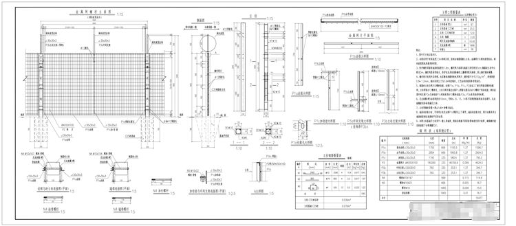 5、钢筋砼立柱与网片以螺栓连接。边框P1a、P1b、P1c、P2应在工厂进行焊接后整体热镀锌;立柱预留φ12螺栓孔,立柱与网片通过边框P1a预留长圆孔以M10螺栓于现场连接;剌丝滚笼中间支架P3a与加劲肋P1c现场采用M10螺栓连接,P3a、P3b采用热浸锌处理。
