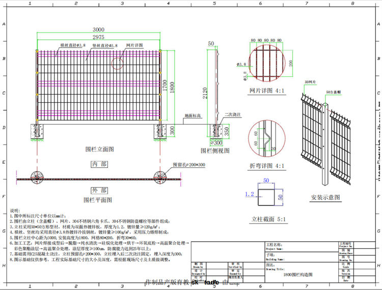 5.围栏立柱中心距为3000,安装高度为1800,网格80*200,折弯30*60;