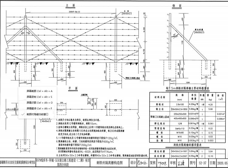 8.刺铁丝隔离栅立柱用56x50x2.5冷弯边槽钢,斜撑用49x50x2.5冷弯边槽钢。刺铁丝隔离栅基础涂沥青防腐处理。