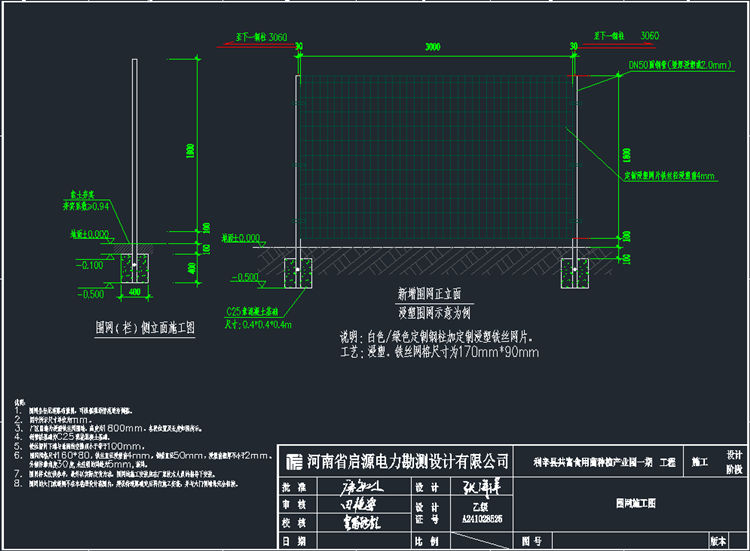 8.浸塑铁丝网围网的大门或道闸不在本卷册设计范围内, 建议待道路确定后再行施工安装, 并与大门侧墙垛完全相接。