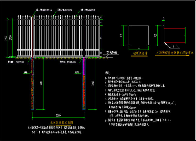 4、光伏区锌钢围栏钢材采用Q235B,焊采E43型,混凝土强度 等级为C30。