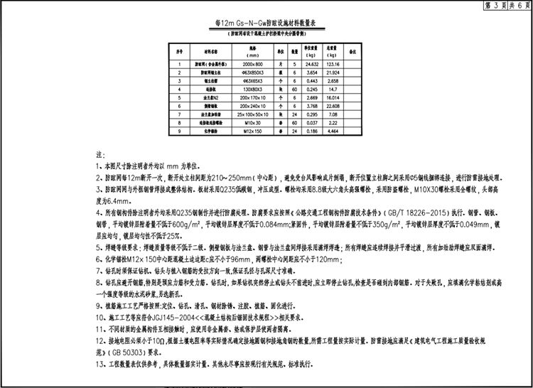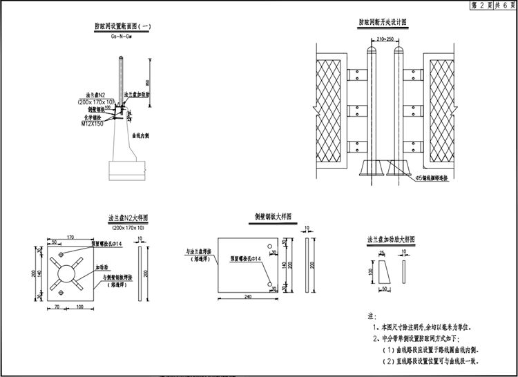 1.本图尺寸除注明者外均以mm为单位。2.防眩网每12m断开一次,断开处立柱间距为210~250mm(中心距),避免受台风影响成片倒塌 ,断开位置立柱脚之间采用Φ5铜线捆绑连接,进行防雷接地处理。3.防眩网与外框钢管焊接成整体结构。板材采用Q235低碳钢,冲压成型。螺栓均采用8.8级大六角头高强螺栓,采用防盗螺栓, M10X30螺栓采用全螺纹,头部高度为6.4mm。4.所有钢构件除注明者外均采用Q235钢制作并进行防腐处理。防腐要求应按照《公路交通工程钢构件防腐技术条件》( GB/T 18226-2015)执行。钢管、钢板、钢带,平均镀锌层附着量不低于600g/㎡,平均镀锌层厚度不低于0.084mm;紧固件, 平均镀锌层附着量不低于350g/㎡,平均镀锌层厚度不低于0.049mm,镀层应均匀,镀层均匀性不低于25%。5.焊缝等级要求:焊缝质量等级不低于二级。侧壁钢板与法兰盘、钢管与法兰盘间焊接采用满焊焊透;所有焊缝应连续焊接并平滑过渡,所有加劲肋焊缝应双面满焊。6.化学锚栓M12x150中心距混凝土边距c应不小于96mm ,两螺栓中心间距应不小于120mm。7.钻孔时须保证钻机、钻头与植入钢筋的受拉方向一致,保证孔径与孔深尺寸准确。8.钻孔应避开钢筋特别是预应力筋和受力筋。钻孔时,如果钻机突然停止或钻头不前进时,应立即停止钻孔,检查是否碰到内部钢筋。对于失败孔,应填满化学粘结剂或高一个强度等级的水泥砂浆,另选新孔。9、植筋施工工艺严格按照:定位、钻孔、清孔、钢材除锈、注胶、植筋、固化进行。10.施工工艺等应符合JGJ145-2004《混凝土结构后锚固技术规程》相关要求。11.不同材质的金属构件互相接触时,应使用非金属套、垫或?;げ闶沽秸吒衾?。12.接地电阻必须小于10Ω ,根据土壤电阻率等实际情况确定接地圆钢和接地角钢的数量,所需工程量按实际计量。防雷接地应满足《建筑电气工程施工质量验收规范》( GB 50303)要求。13.工程数量表仅供参考,具体数量据实计量.其他未尽事项应按现行有关规范、标准执行。