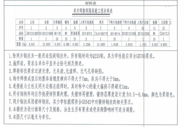 1.除网片钢丝为一般用途低碳钢丝外,所有钢材均为Q235钢,其力学性能应符合GB700要求。