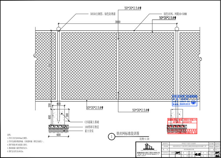 野生动物危害防控建设围栏项目工程设计图纸要求1、围栏立柱为50*50mm方管,立柱顶部焊接圆形装饰球。2、网片采用斜方孔焊接网片。3、网孔大小为50*50mm。4、网丝采用2.5mm低碳钢丝制作。5、围栏边框采用30*50mm矩形管,厚度为2.5mm。6、围栏整体尺寸为1.5米高,3.0米宽。7、围栏整体采用镀锌+喷塑防腐工艺处理。