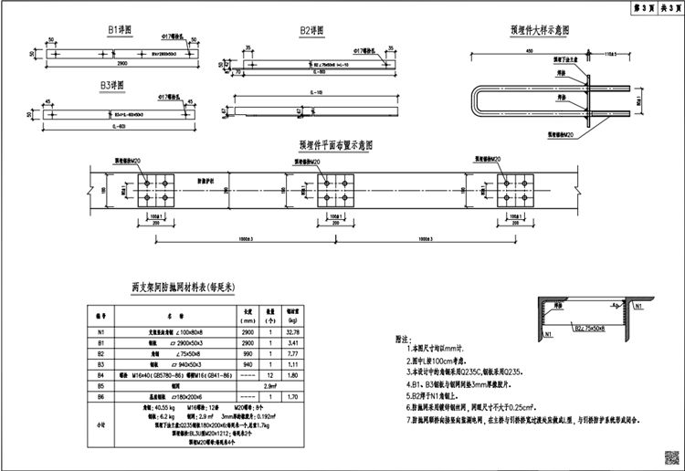 4.B1、B3钢板与钢网间垫3mm厚橡胶片。