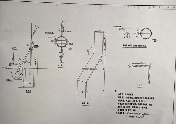 7.斜撑应作热浸锌防腐处理,先镀锌再镀塑,镀层厚度详见设计说明,镀塑颜色与立柱一致。