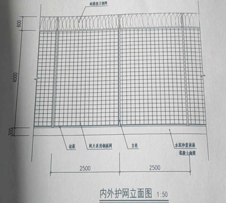 1、本工程为中度戒备监狱。围墙内侧5.0m及外侧10.0m处应各设一道高度不低于4.0m的防攀爬金属网。
