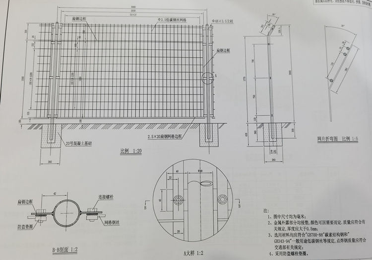 混凝土立柱用混凝土标号不低于C20,拌制混凝土所使用的各项材料及混凝土的配合比、拌制、浇筑、养护应满足有关标准的规定。电焊网的立柱、斜撑采用有缝焊接钢管,其公称尺寸为Φ48X3.5mm,斜撑采用角钢。刺钢丝隔离栅的立柱与电焊网(包括网片与立柱等)均为绿色,其具体颜色须经业主确认后方