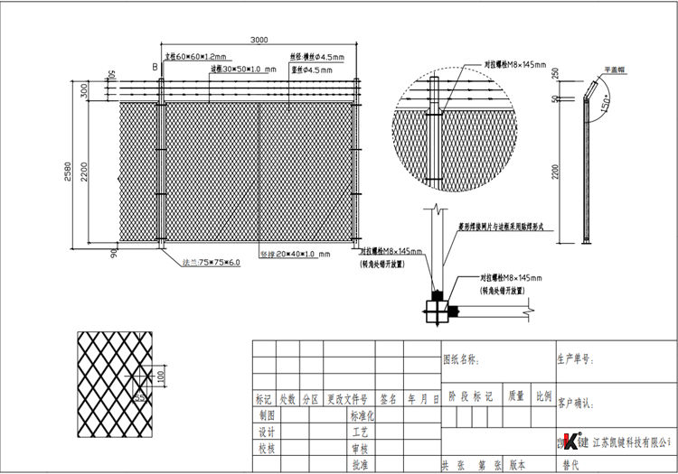 4、海关围网立柱采用60*60*1.2mm方管,立柱底端焊接75*75*6.0mm法兰。