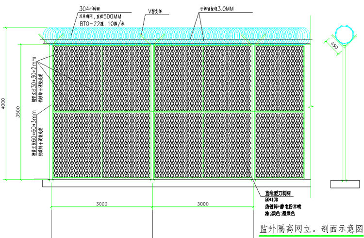 10、监狱金属网墙的顶部应设道蛇腹型刀刺网, 蛇腹型刀刺网材质宜为304不锈钢, 刀片形式宜为BT0-22。