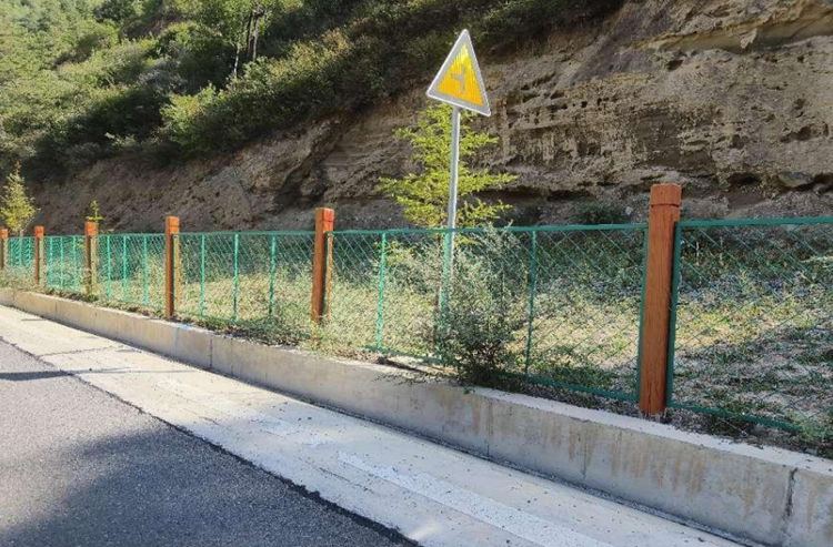 农田防护网立柱做法:预埋C25砼立柱高1.8m(120mmx120mmx1800mm),表层涂刷5mm 仿木石漆,提前在立柱上预埋M20*130螺栓,立柱和网片通过焊接连接,用螺丝将连接件固定在一起。