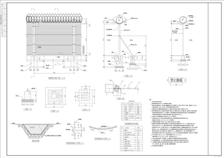 3.图中机场隔离网立柱上部应加盖柱帽,立柱与机场隔离网网片、 立柱与斜撑及立柱与延伸臂的连接采用防盗形式并经防腐处理。