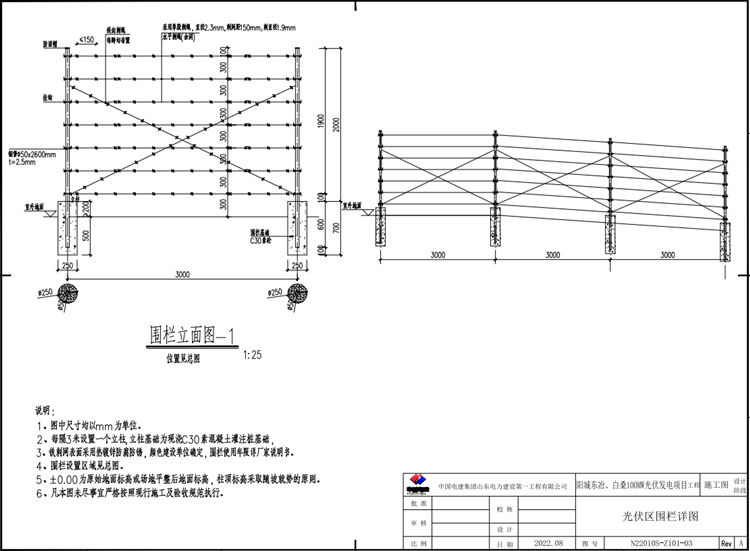 9、光伏区围栏未注明的钢材材质为Q235B ,混凝土强度等级为C30。
