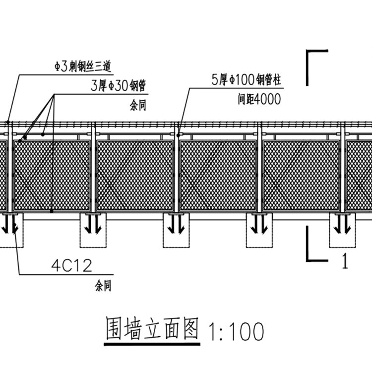 1、金属围墙立柱采用Φ100*5.0mm镀锌钢管制作而成,立柱间距4000mm,立柱焊接法兰盘,打膨胀螺丝固定立柱。