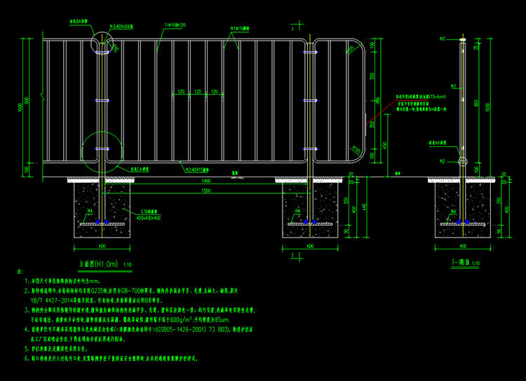 1、本图车行道护栏尺寸单位除特殊标注外均为mm。