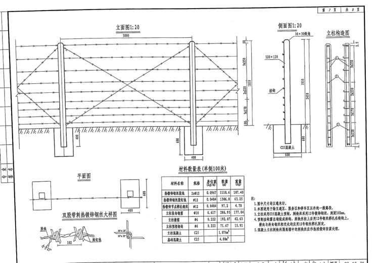 广西玉林养殖场刺钢丝围栏专业生产厂家1.图中刺钢丝围栏尺寸均以毫米计。2.本图刺钢丝围栏适用于除互通区、服务区和停车区以外的一般路段。3.刺钢丝围栏立柱采用C25混凝土预制,刺钢丝采用12号镀锌钢丝,刺距102mm。4.刺钢丝围栏预制挂钩露出端做成斜钩,刺钢丝拉上后用12号钢丝绑扎在铁钩上,横向与斜向钢丝相交处均应用12号钢丝绑扎固定。5.混凝土立柱刺钢丝围栏中的刺钢丝应作热浸镀锌防腐处理。