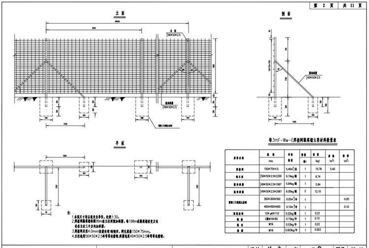 4.焊接网隔离栅立柱选用56X50X2.5冷弯等边槽钢,斜撑选用49X50X2.5冷弯等边槽钢。