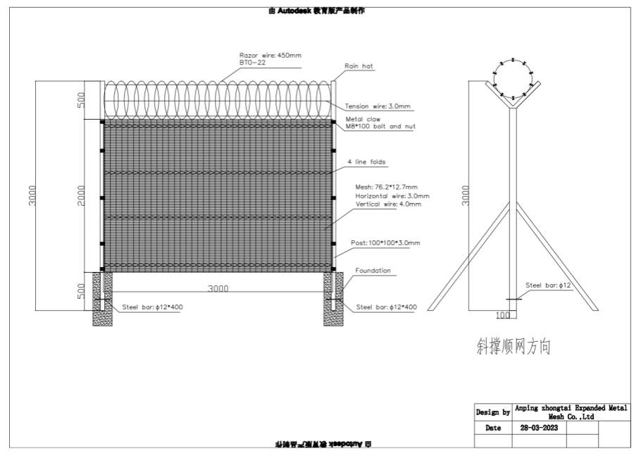 围栏·面板规格:面板尺寸3305mmx2500mm,孔径尺寸(中心)76.2mmx 12.7mm,电线尺寸定制(最小4mm/4mm)、水亚带4x50mm深V法兰2x70°x75mm+2x30°或2x90°x50mm、包括通孔螺栓系统立柱规格:栅栏板高度2.5米,立柱长度至少3.0米,立柱尺寸85mmx45mmx85mm锥形柱或150mmx75mmx150mm 锥形柱锁定凹槽机制包括,包括聚合物盖,后处理镀锌并涂有铝。