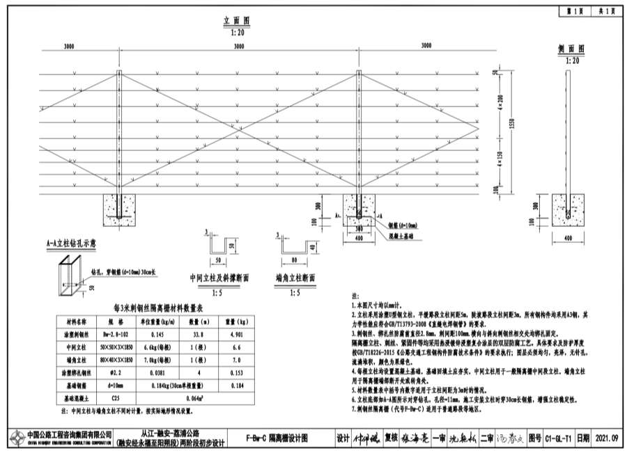 2.立柱采用涂塑U型钢立柱,平缓路段立柱间距5m,陡坡路段立柱间距3m。所有钢构件均采用A3钢,其力学性能应符合GB/T13793-2008《直缝电焊钢管》的要求。