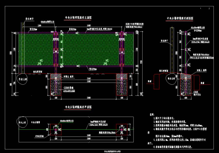 5.立柱间距2.4m,栏网标准段长度2.32m,基础注意避开乔木树干。
