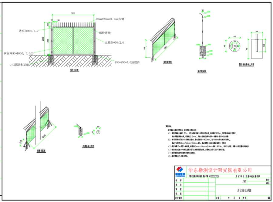 (1)围栏顶端高出地面2.35m,主要由热镀锌钢立柱及钢网构成,钢立柱跨度约3.0m,围栏顶端向站区外弯折,钢丝网需做浸塑处理,浸塑厚度1.5mm,其余未作说明材料均采用“热镀锌+ 浸塑”方法防腐。